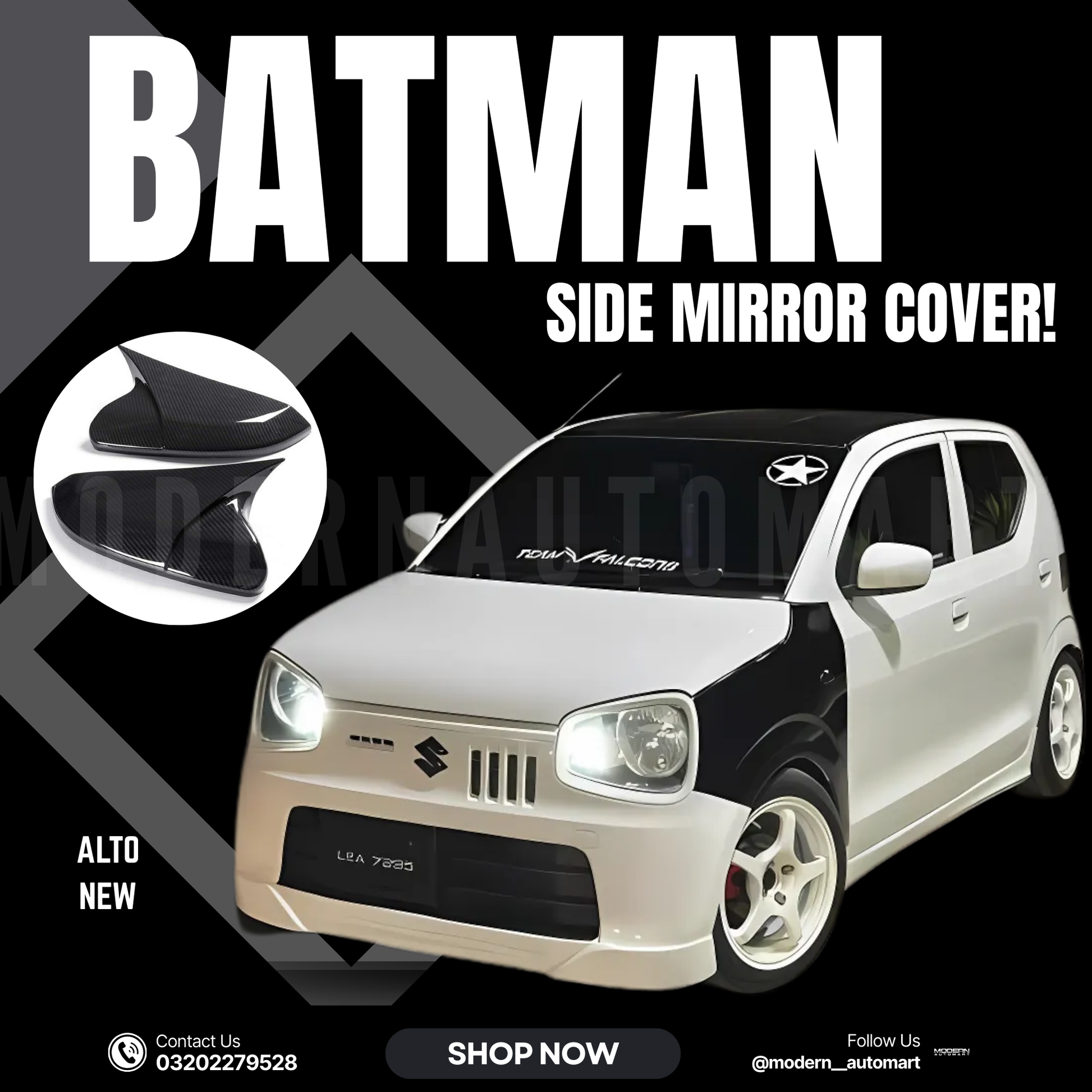 Give your Suzuki Alto a bold, sporty upgrade with this Batman-style carbon fiber side mirror cover. Designed for 2019-2025 models, it delivers a perfect mix of premium craftsmanship, sleek design, and mirror protection.
