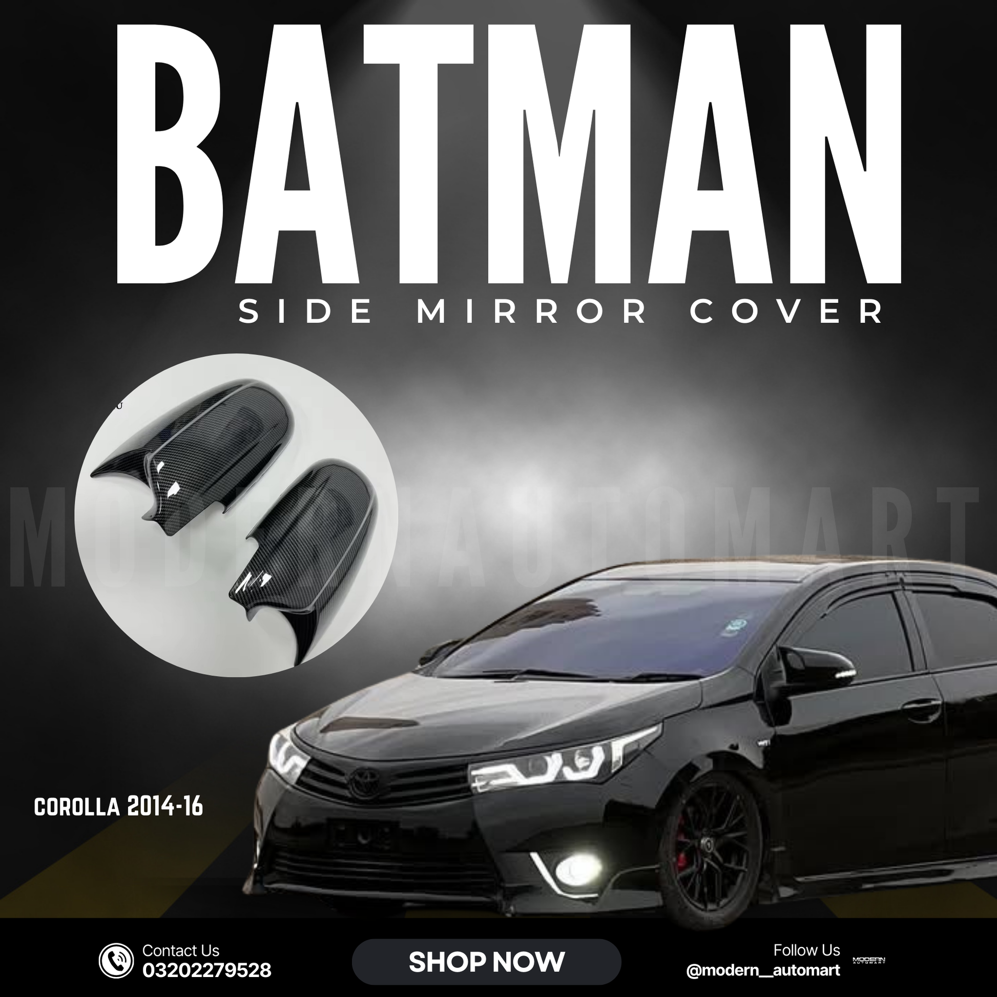 Give your Toyota Corolla a sharp, sporty edge with this Batman-style carbon fiber side mirror cover. Specially designed for 2014-2016 models, it combines premium craftsmanship with aggressive styling for a standout upgrade.